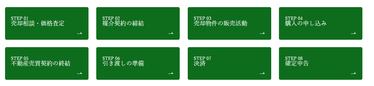不動産売却の流れは、大きく分けて「売却相談・価格査定」「媒介契約の締結」「売却物件の販売活動」「購入の申し込み」「不動産売買契約の締結」「引渡しの準備」「決済」「確定申告」のステップで進みます。