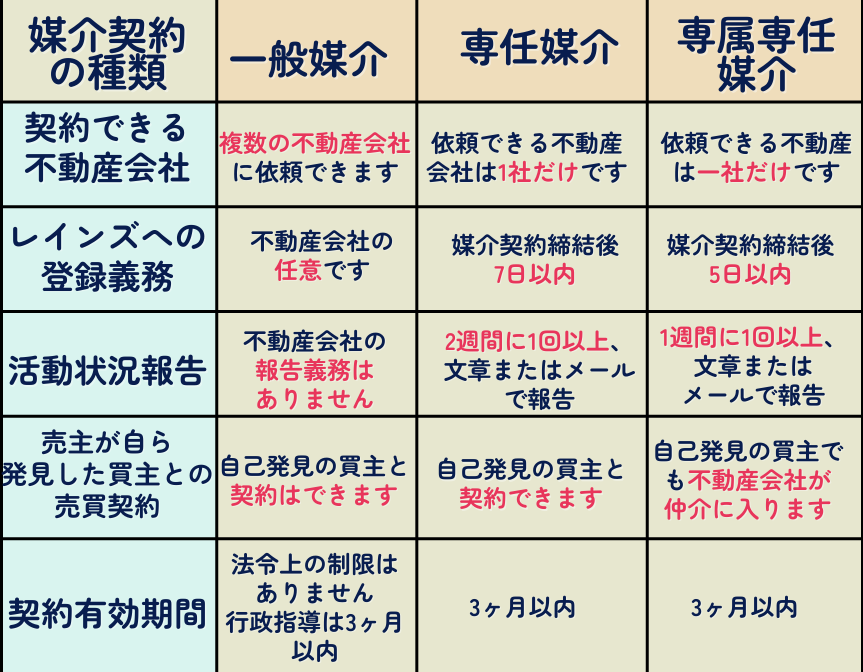 媒介契約の種類には、一般媒介、専任媒介、専属専任媒介といった形式があり、それぞれ特徴が異なります。