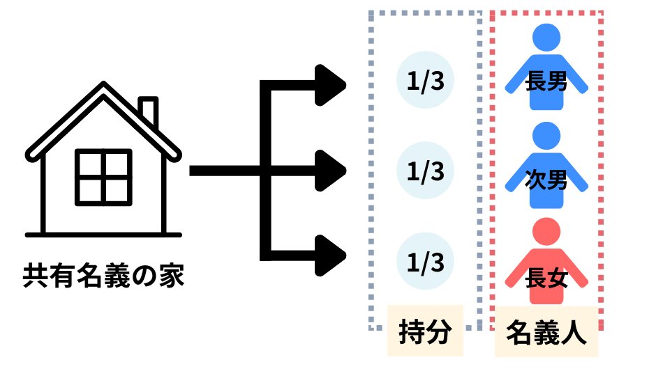 ● 例:兄弟三人で実家を相続した場合、全員がその土地や建物全体に対して持分(例えば3分の1ずつ)を持ちます。
